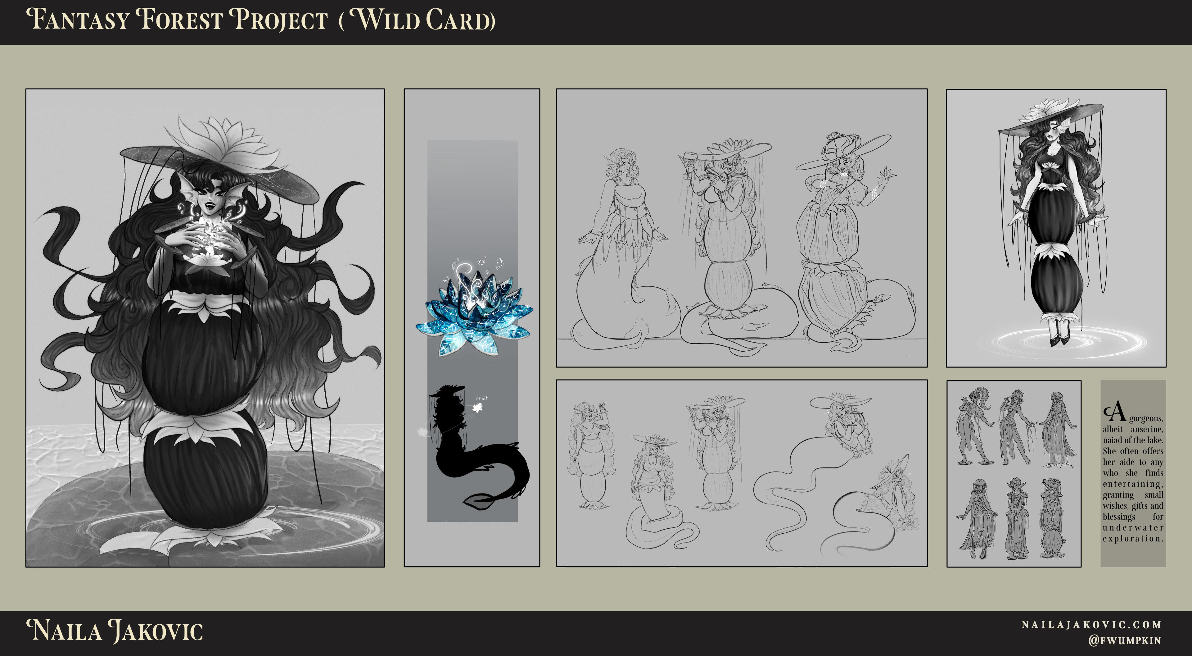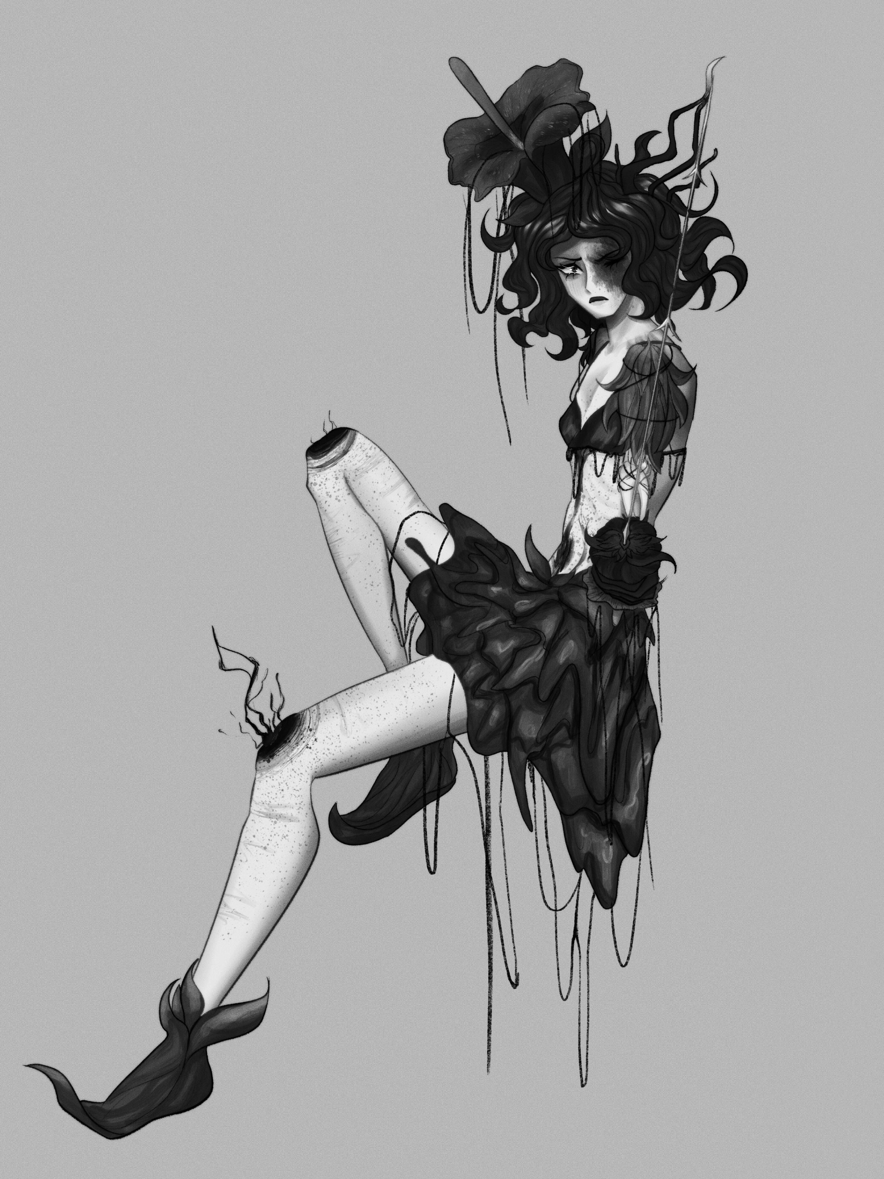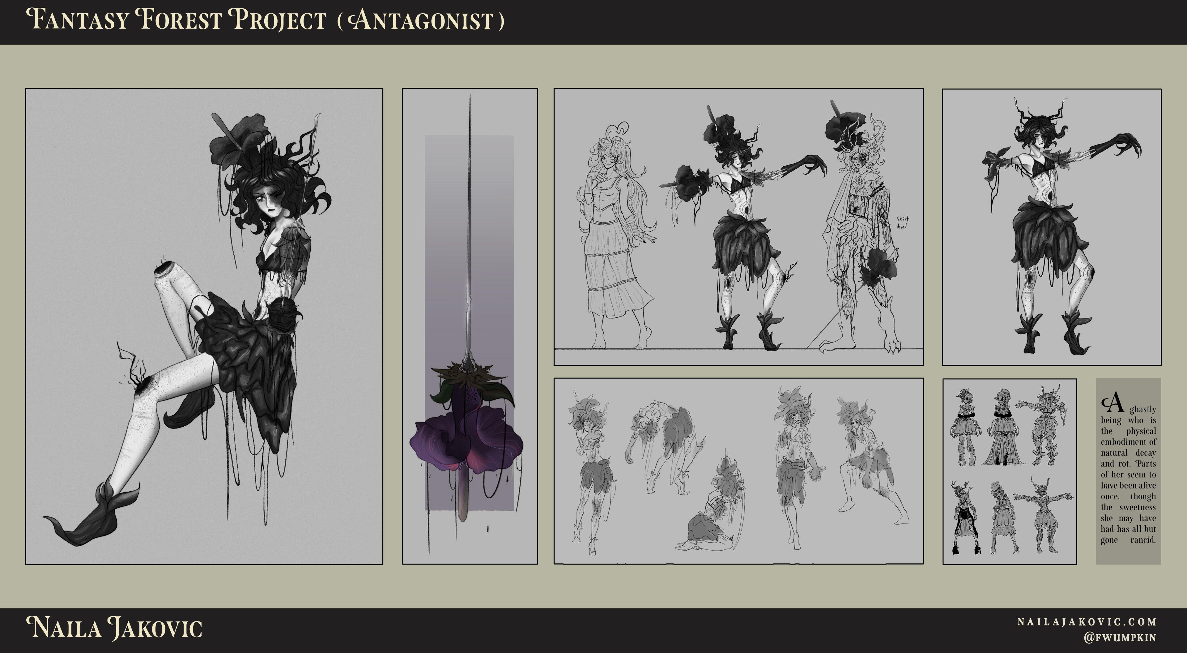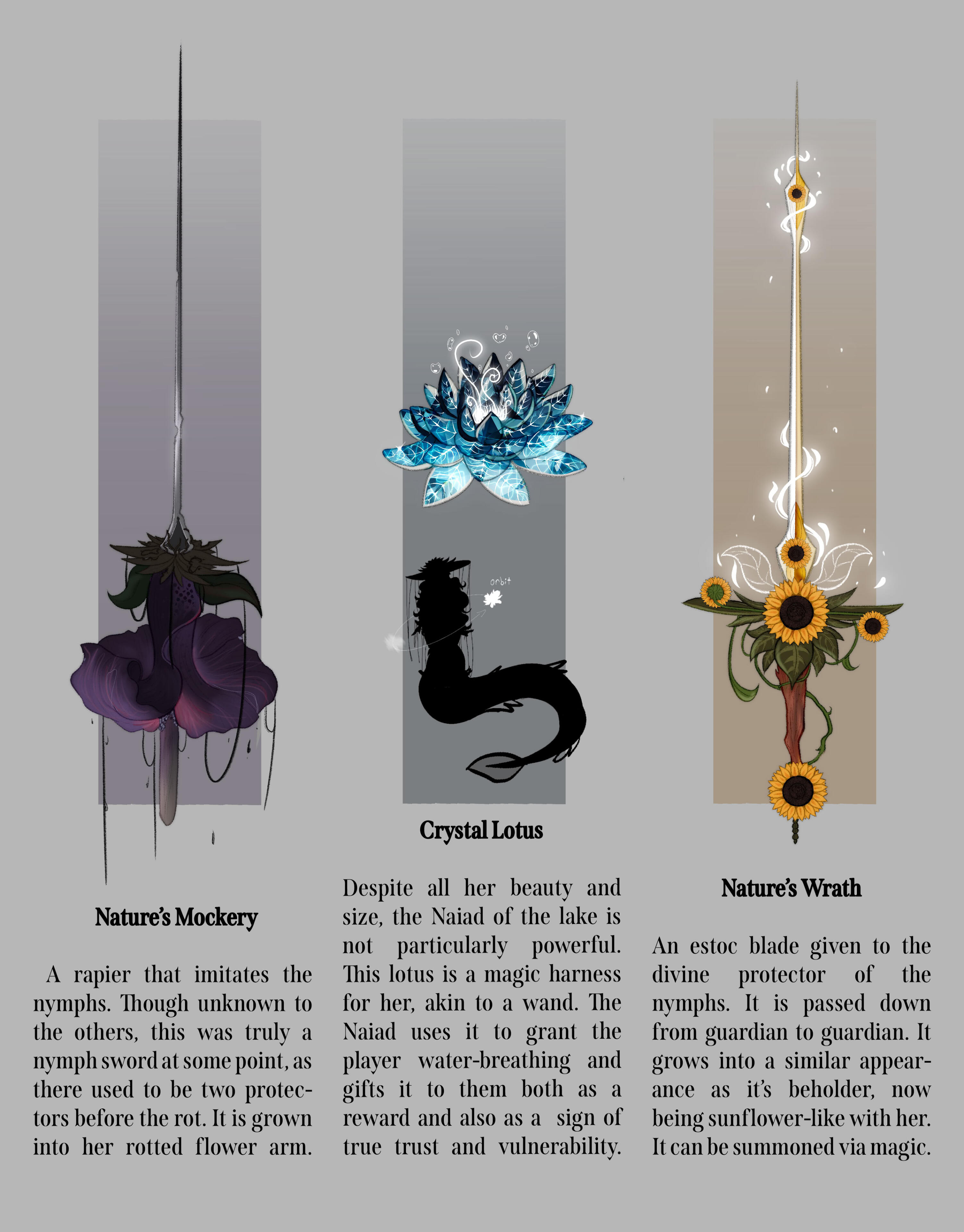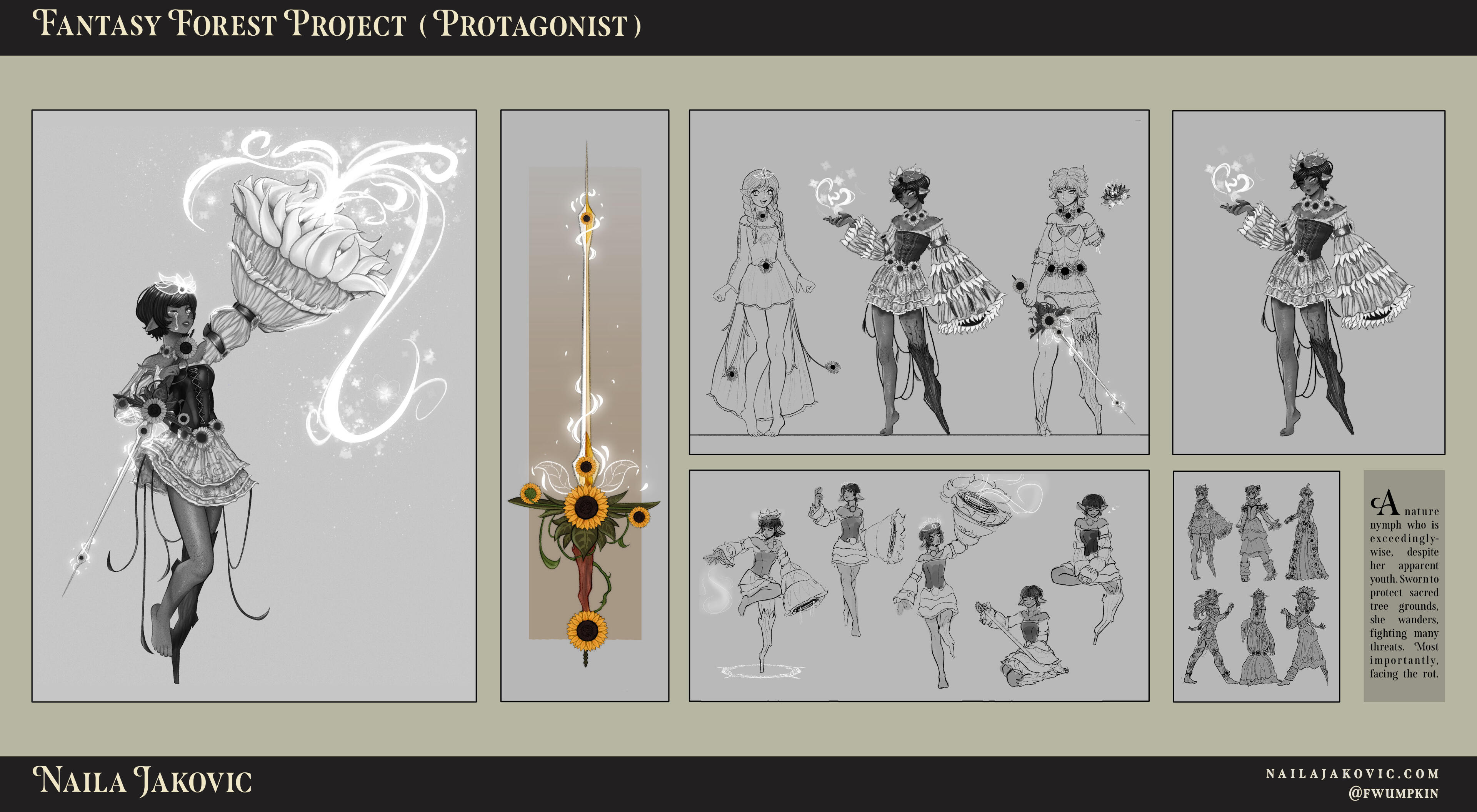 The Withering Grove is a high fantasy game project I created in 2023.This project is placed in a fantasy forest world, following the protagonist – a sunflower nymph. Along with her I also designed the antagonist, a prior nymph taken over by the manifestation of rot; and a wildcard character, the naiad lady of the lake.