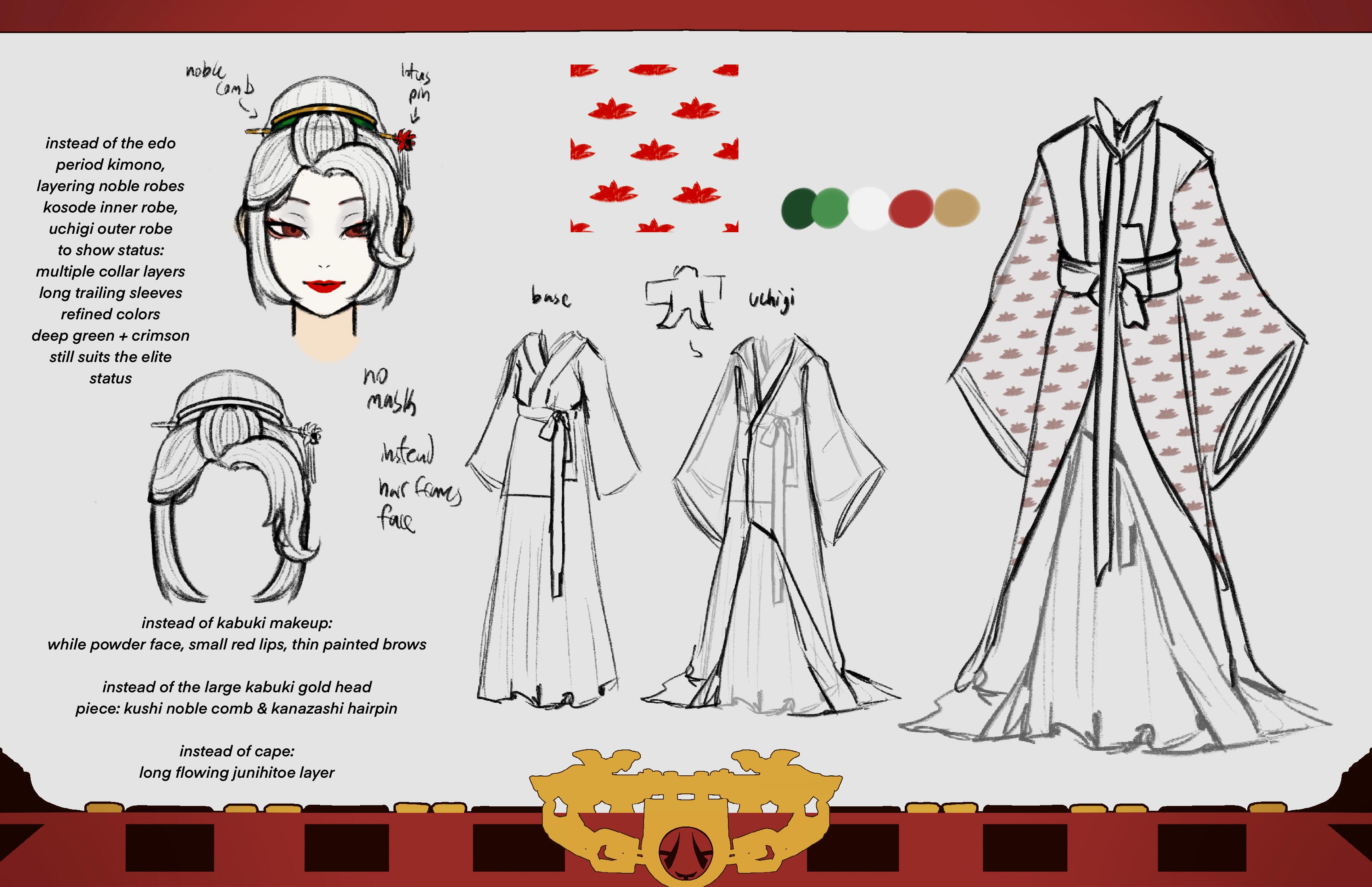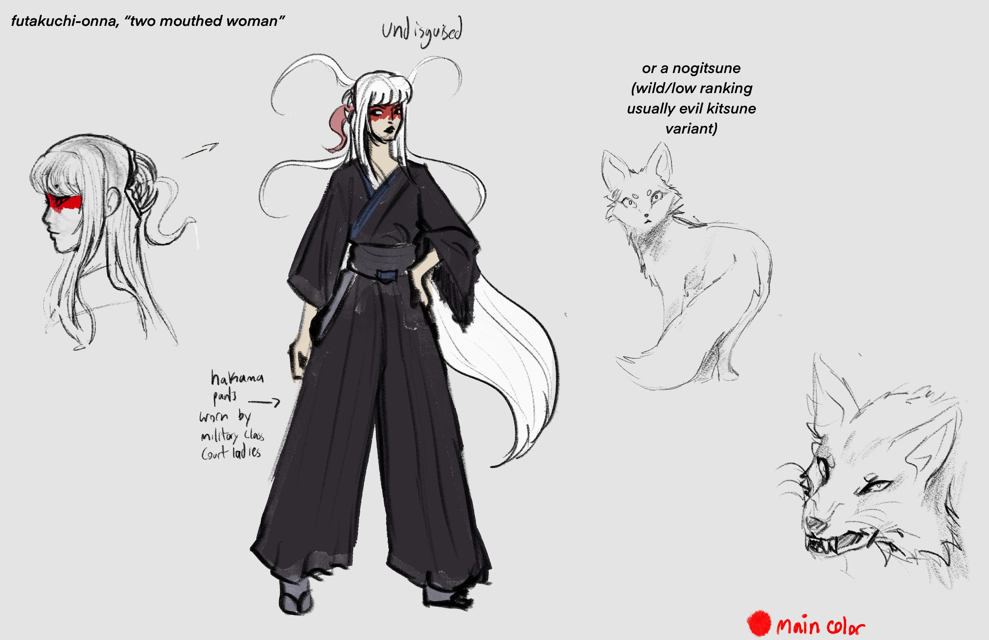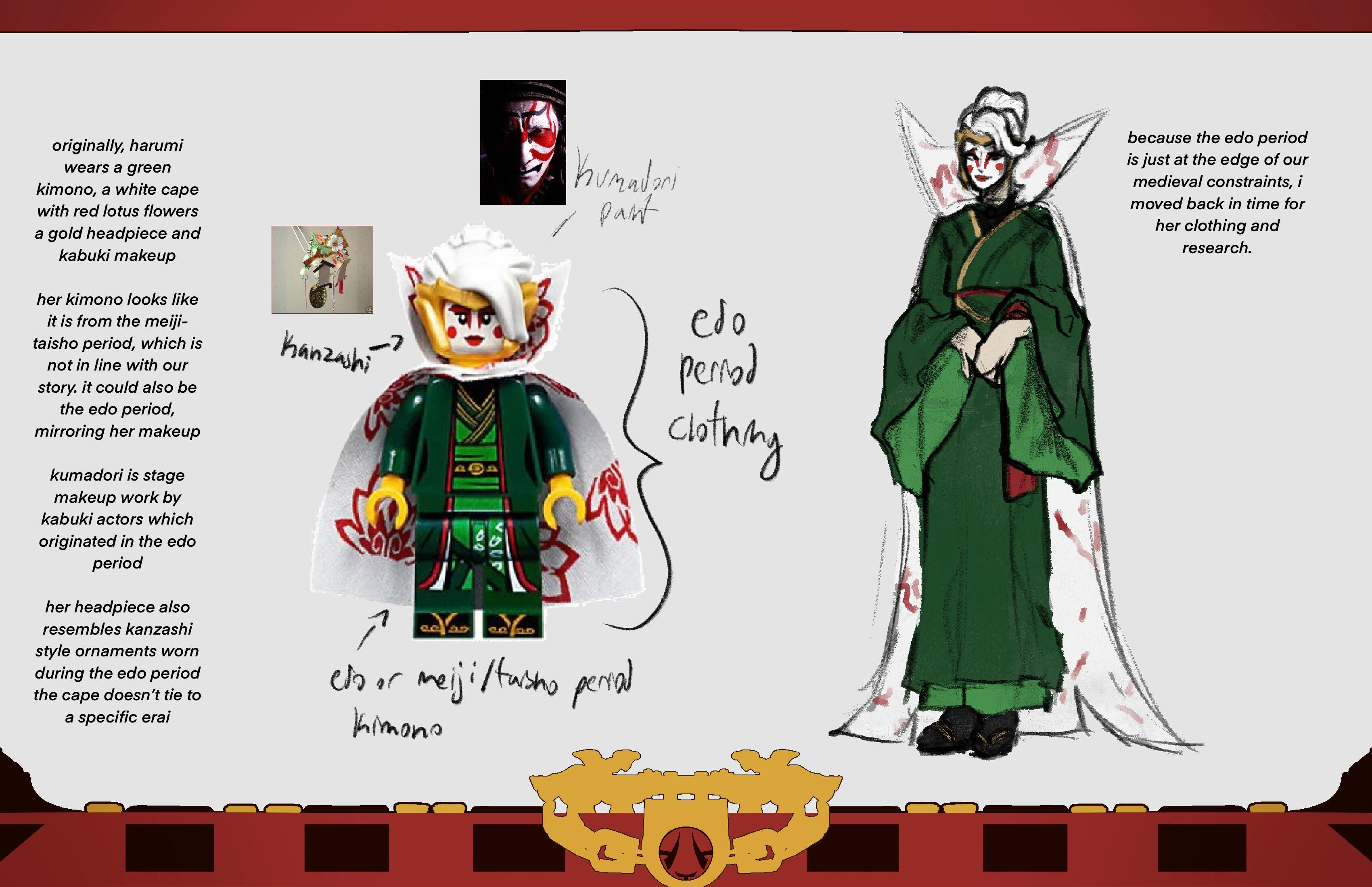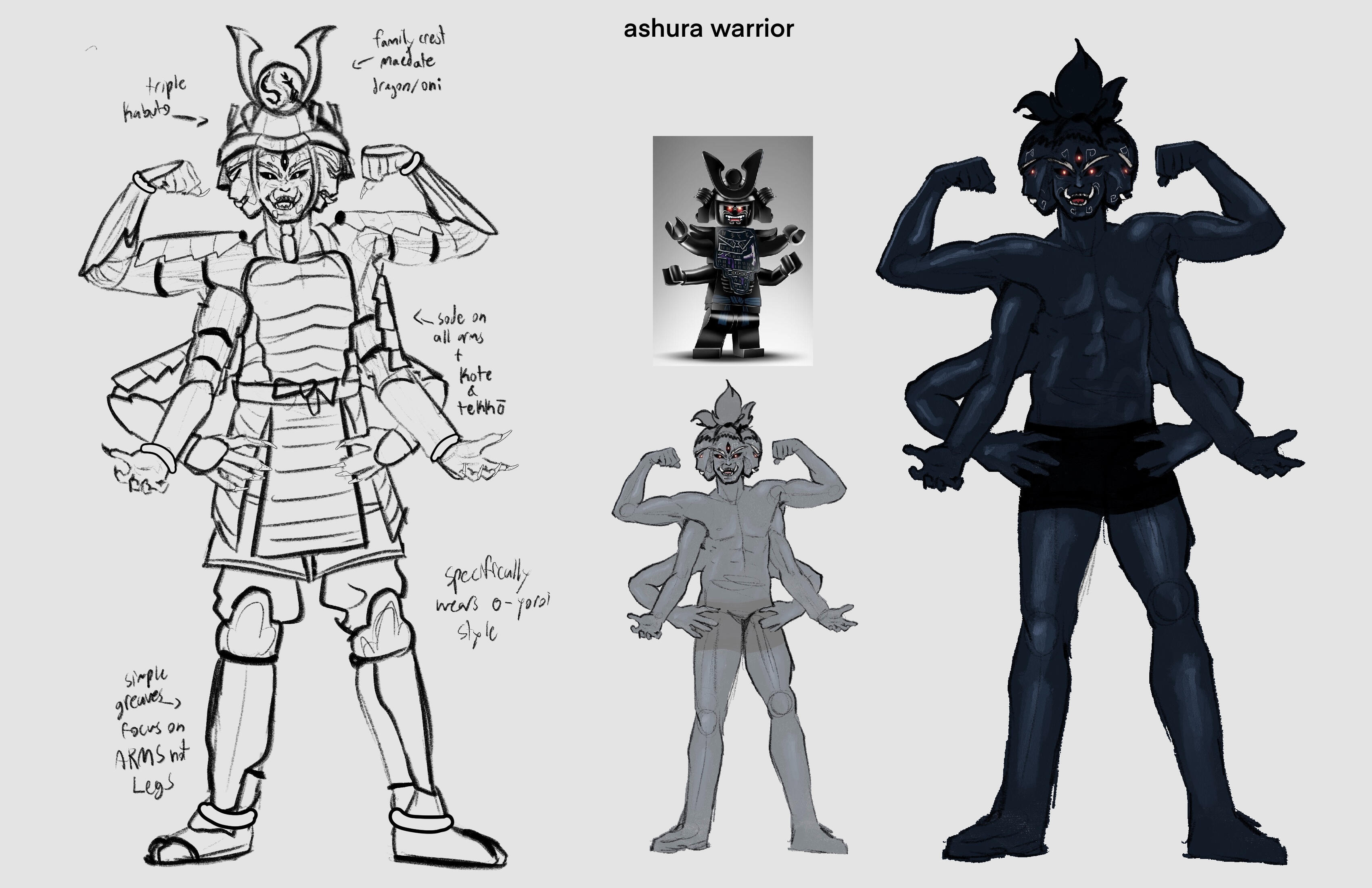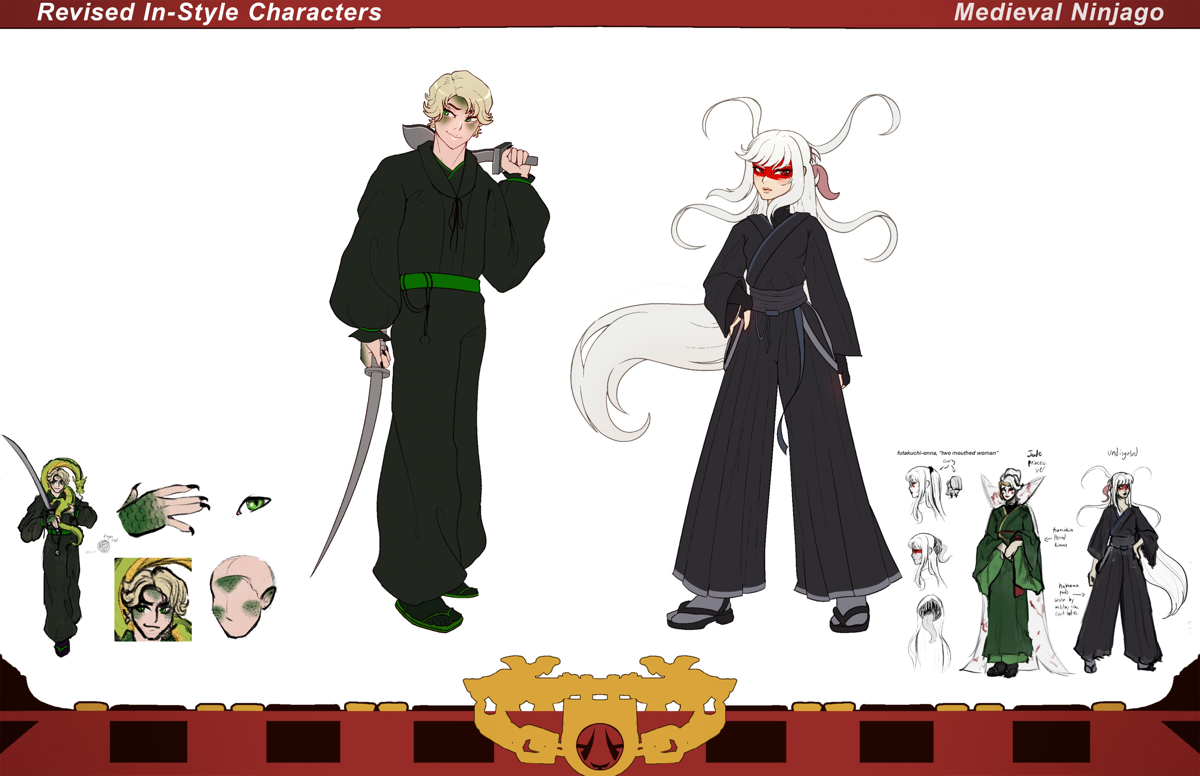 "The Oni Heir Trilogy" adapts the “Sons of Garmadon” storyline into three animated films for an older audience. We wanted to focus on dark medieval fantasy as a genre, but specifically Japanese medieval fantasy - not European. The project was designed to feel mature despite the animated medium, which we took great care to experiment with. It was created in collaboration with Sebastian Sunga, Irulan Sands, and Natalie Frank.This series takes place in Medieval Japan. While it is not one specific time period, it is rooted in the history and culture in Japan from 1185-1603 CE. Monsters or other species in the show are replaced with similar Yokai variants. The only drastic change is to the race of the ninja and other important characters.While the ninjas are Yōkai, the civilians and side characters are still humans, with the exception of certain cursed or otherwise unique individuals. One such is Harumi, whose affliction as a Futakuchi Onna (two-mouthed woman) is the result of a curse. This kind of curse is something that would be fairly common in this world, and it’s a logical way to represent the mystical nature of Yōkai and their connection to curses or unnatural powers.The majority of ninja being Yōkai instead of humans ties directly into their role as elemental masters. In the main series, the ninjas are (mostly) humans who wield elemental powers, but their powers are rooted in supernatural energy that is far beyond what normal humans can harness. In the context of medieval Japan, this supernatural energy could manifest more naturally as Yōkai, which are supernatural creatures deeply tied to the natural world, spiritual forces, and mystical energy aligning perfectly with the elemental abilities they wield. The shift from monsters in the original series to Yōkai allows for a more natural integration of Yōkai into the world while still maintaining the core spirit of Ninjago, where the elemental powers are central to the characters' identities.