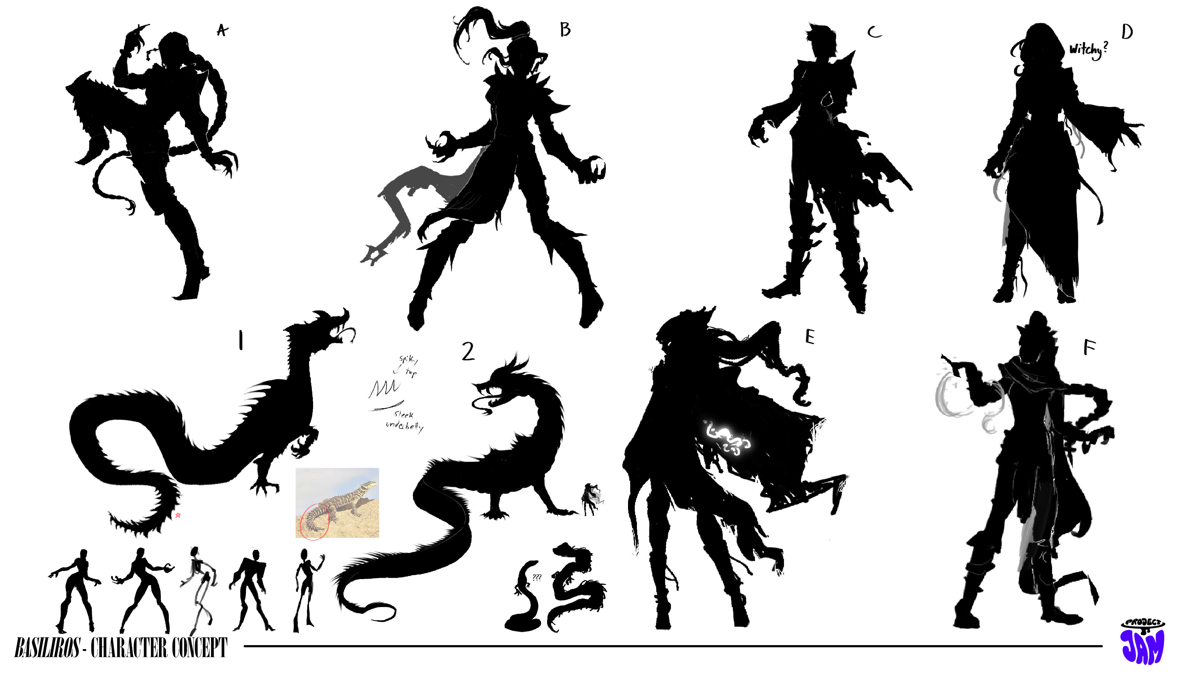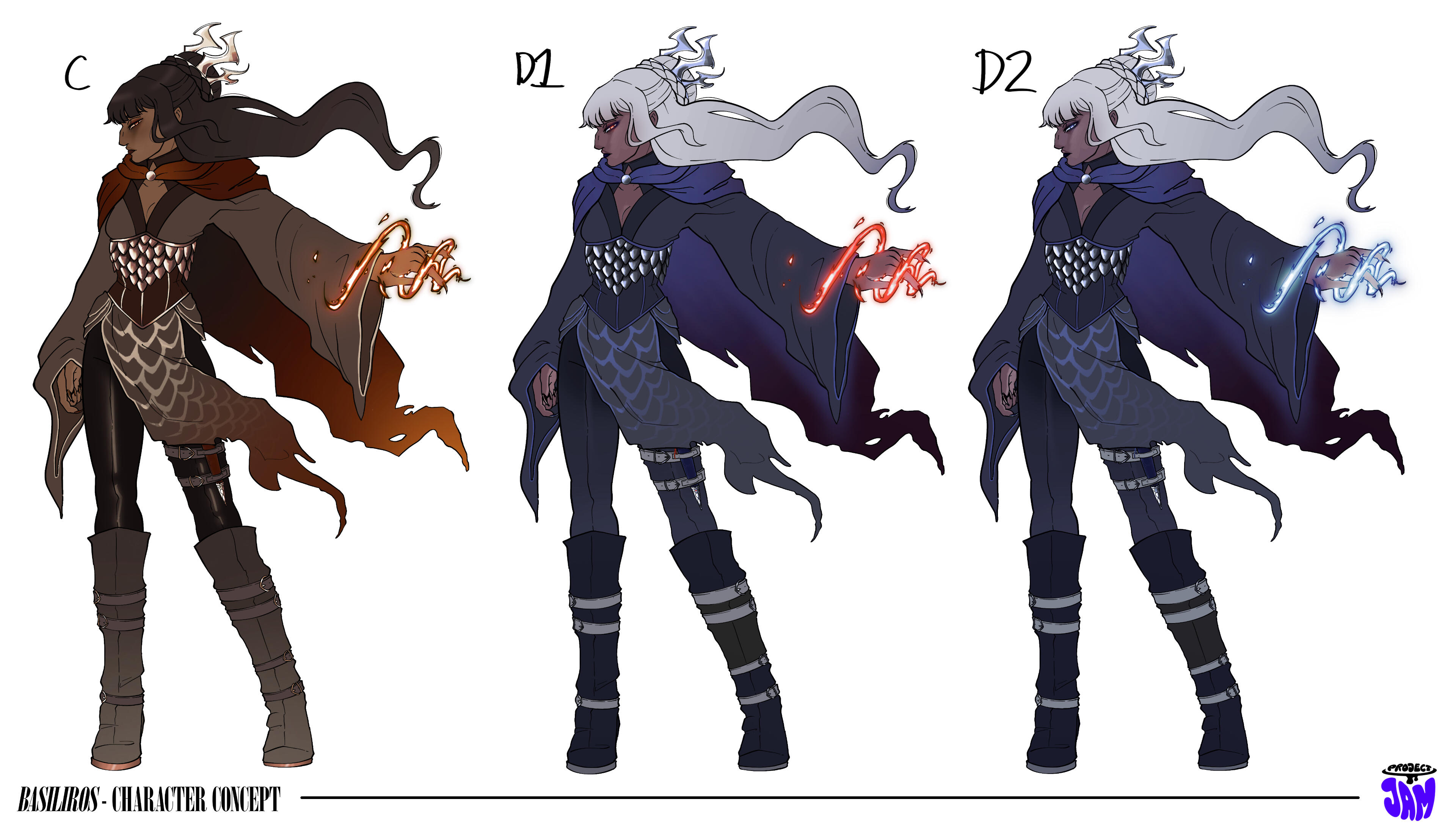 Basiliros is a game project created by the studio Project Jam and lead by Phuong Le. Set in a universe that suddenly has other worlds collide with it via magic, we follow the protagonist Florian as they adventure through diverse environments, cultures and genres.I contribute as a character and creature designer creating Charys - the right-hand of the main antagonist - in both her human and Lindworm forms, along with the creature designs for the High Seas region.